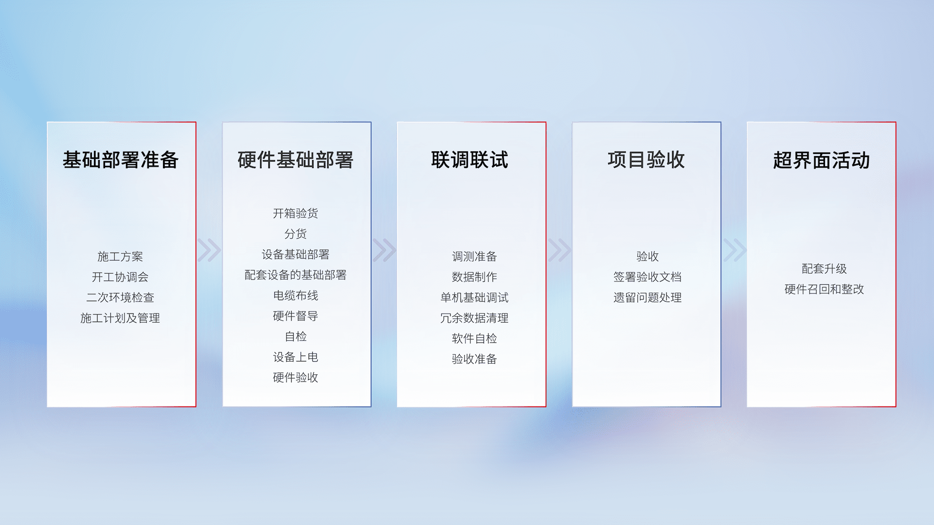 从基础部署准备、、硬件基础部署、、联调联试、、项目验收、、、越界面活动的全过程可追溯,,保证施工质量和进度。。。
